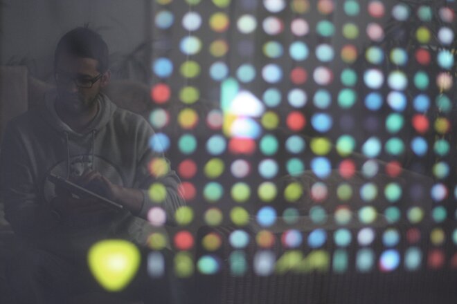 While creating the website of the musican Karlo Jurina, we figured out that the iPad is a great input device to track his hand and finger moves while imitating a guitar or somehow dancing with his fingers on the iPad. Those moves have been recorded and then transformed into the visuals of his website.