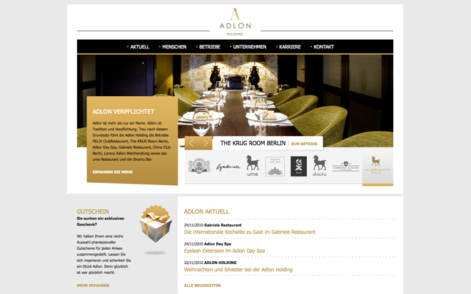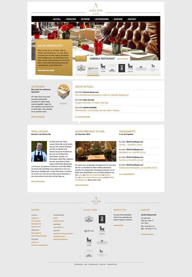 Together with Powerflasher we created the new online appearance for the Berlin based Adlon Holding. We were responsible for the design part. Our ambition was to transfer the complex structure of the Adlon Holding in a significant working, simple and clear design. Powerflasher realized the project in TYPO3.