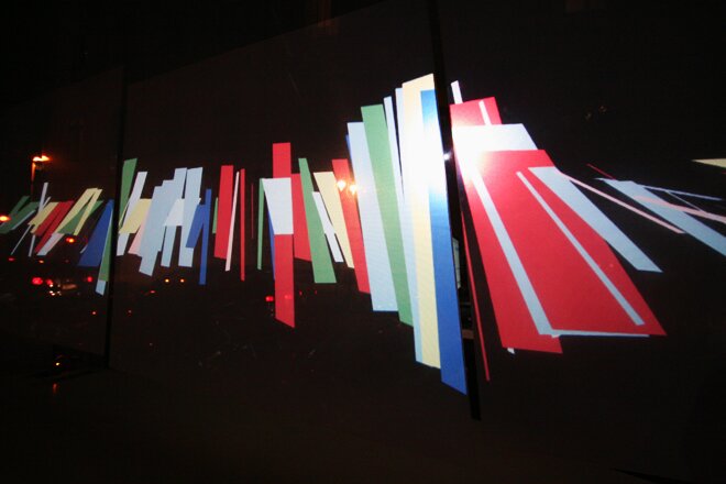 In this episode three-dimensional stripes stand up when people walk by and piano sounds are played according to the peoples position and speed.