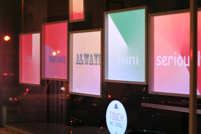 Animated by the 90ties-male-adolescence-dream Samantha Fox, the passers-by can change the words of a random sentence by “touching” the window. Also color and font are changing randomly. The visual outcome is supported by a machine voice generated by apples speech, speaking or singing the originated sentence with randomly selected voices.