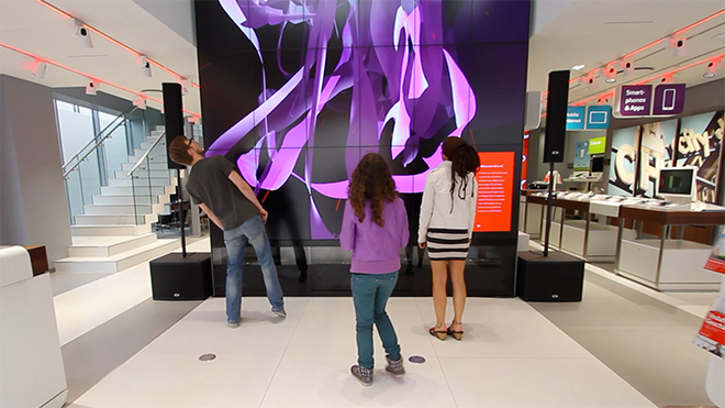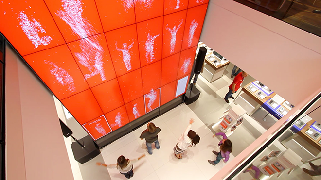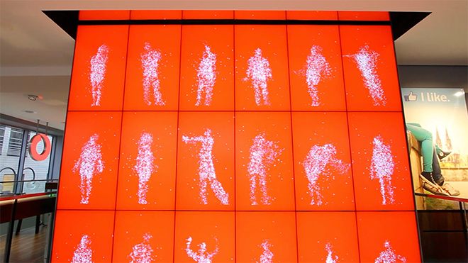 6 Kinect sensors track an area of 3,5 × 3,5m in front of the display, with an height of about 2 meters and a minimum distance to the screen of about 0,5 meters. The Kinect image is processed by 3 computers and passed to another machine, that merges all the 6 images to a homogeneous coordinate system. The two visual clients are written in Java based on Processing and OpenGL. Those applications receive the merged kinect image, detect the people and use the individual point cloud to create some fancy stuff. The deterministic garbage collector of the JRockit VM ensures the required 60 frames a second. An ATI FirePro™ V9800 provides a joint view of 2160×3840 pixels channeling trough 4 mini-display ports.