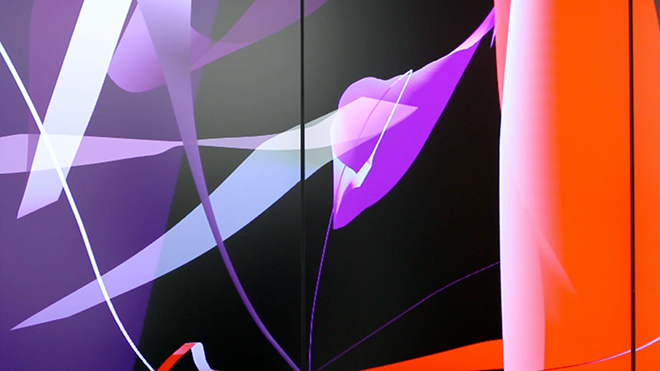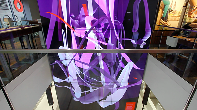 The visitors create 3D like painting. A 3,5 × 3,5m detection area in front of the display transforms the visitor into a “digital brush”. Properties such as the velocity or position of the person define the drawing style. Thus So, after hours, the painting reflects the actions and activities of all visitors.